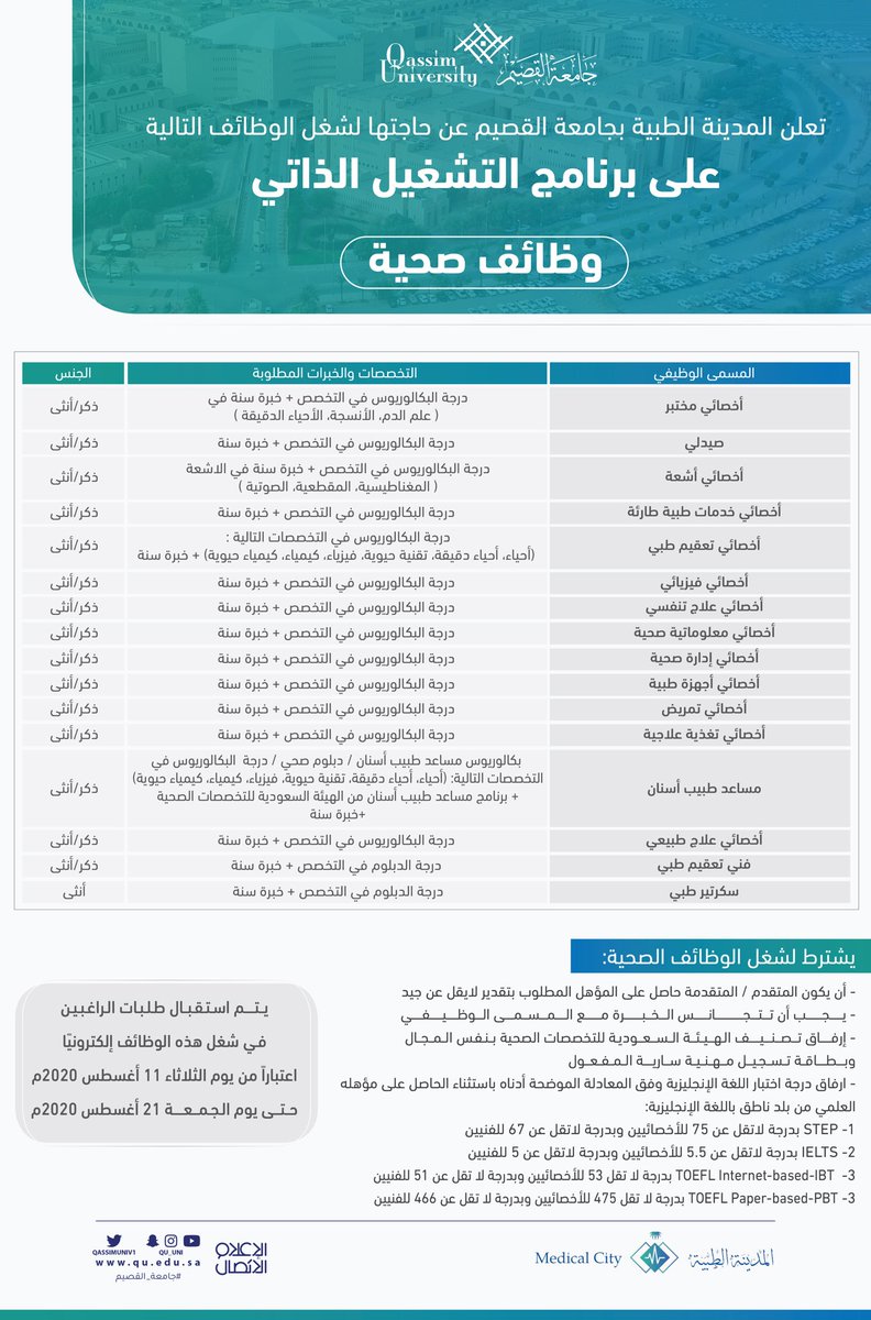 أعلنت المدينة الطبية بجامعة القصيم عن توفر 19 وظيفة صحية وطبية شاغرة للرجال والنساء على برنامج التشغيل الذاتي وذلك حسب التفاصيل الموضحة أدناه:
