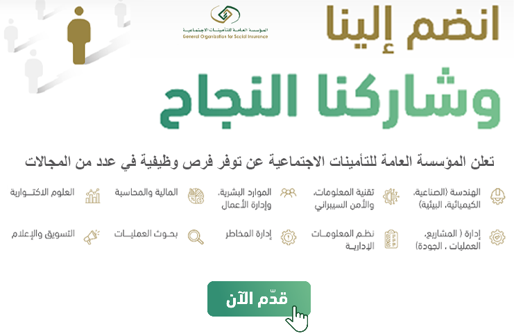 أعلنت المؤسسة العامة للتأمينات الاجتماعية فتح باب التوظيف للوظائف الإدارية والتقنية والهندسية وذلك حسب التفاصيل الموضحة أدناه:-