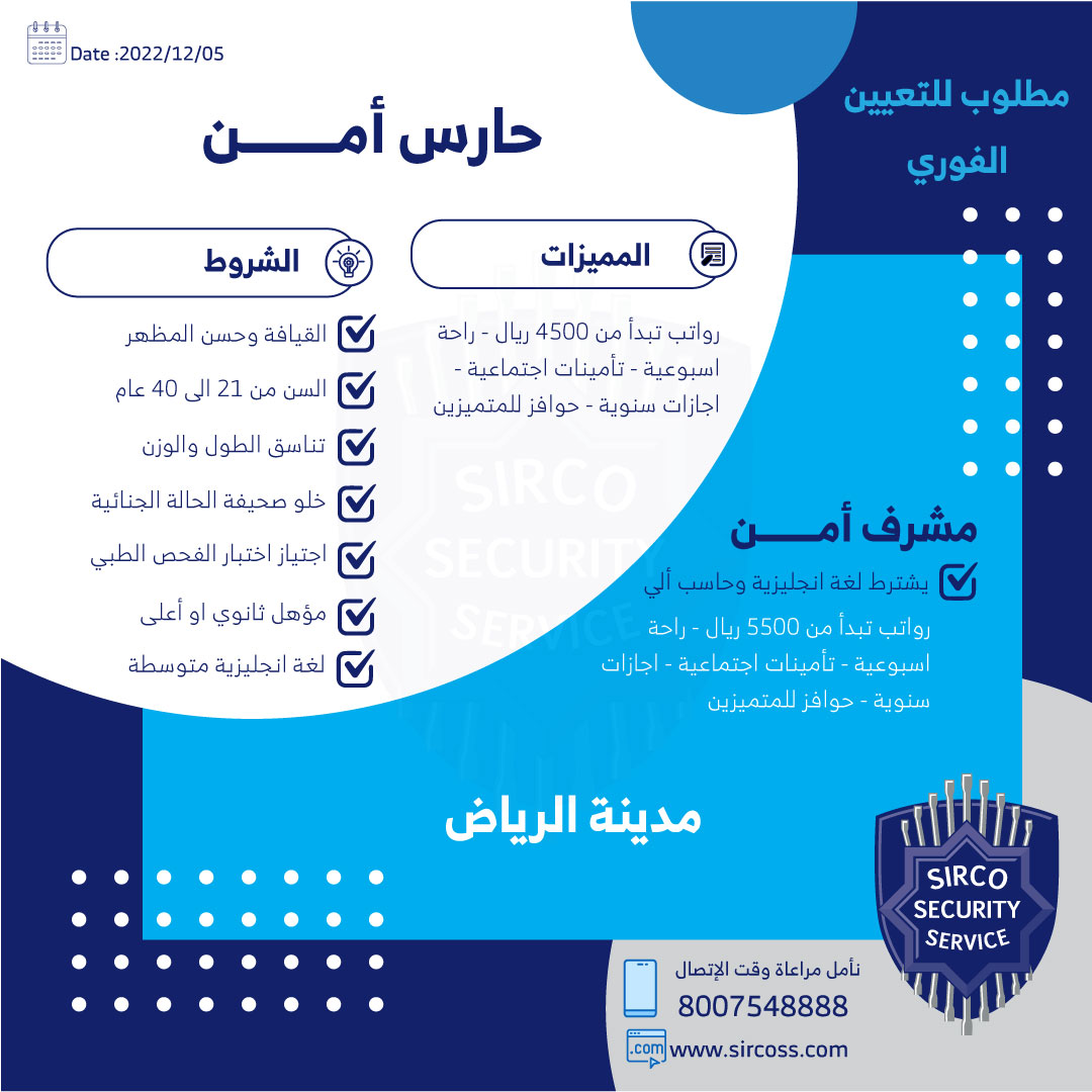 أعلنت الشركة السعودية العالمية للخدمات الأمنية (سيركو) عن فتح باب التوظيف للوظائف الأمنية والإدارية بالرياض وذلك حسب التفاصيل الموضحة أدناه:-