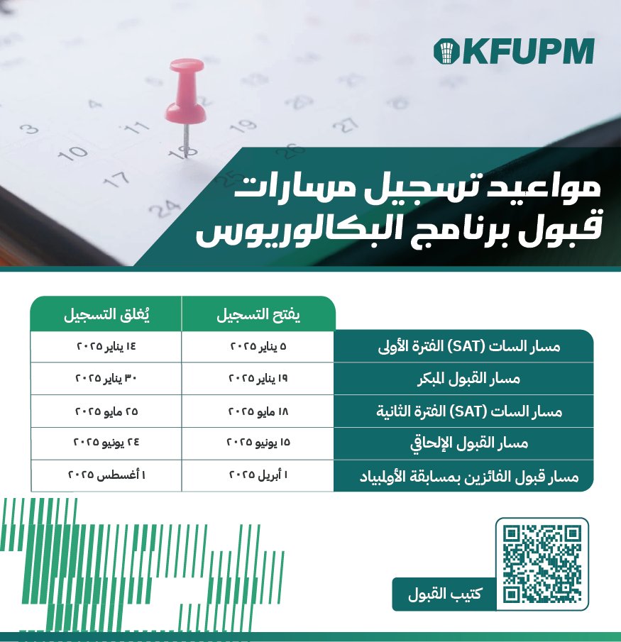 جامعة الملك فهد للبترول والمعادن تعلن عن موعد فتح باب التسجيل لخريجي وخريجات الثانوية العامة، للانضمام في برامج (البكالوريوس) للعام الجامعي 2025م في مختلف التخصصات وذلك حسب التفاصيل الموضحة أدناه:-