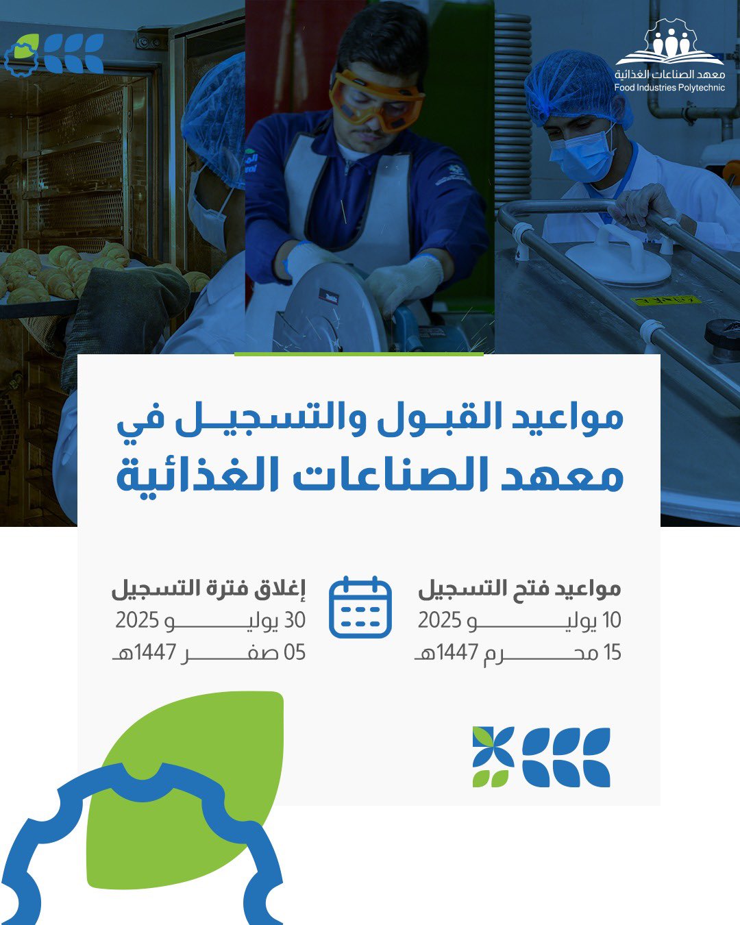 معهد الصناعات الغذائية، والذي تأسس بشراكة استراتيجية بين المؤسسة العامة للتدريب التقني والمهني وشركة المراعي وبدعم من صندوق الموارد البشرية يعلن عن فتح باب القبول والتسجيل للفصل التدريبي الأول للعام الأكاديمي 2025-2026 في عدد من برامجه المتخصصة، وذلك حسب التفاصيل الموضحة أدناه:-