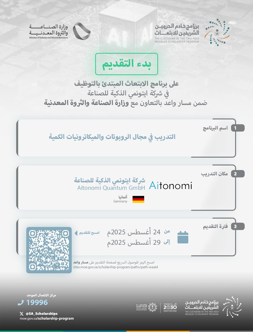 شركة ايتونمي الذكية للصناعة بالتعاون مع وزارة الصناعة والثروة المعدنية، ضمن مسار واعد لبرنامج خادم الحرمين الشريفين للابتعاث الخارجي، عن فتح باب التقديم لبرنامج الابتعاث المبتدئ بالتوظيف في مجال الروبوتات والميكاترونيات الكمية، والذي يستهدف الكفاءات السعودية للتدريب في ألمانيا، وذلك حسب التفاصيل الموضحة أدناه:-