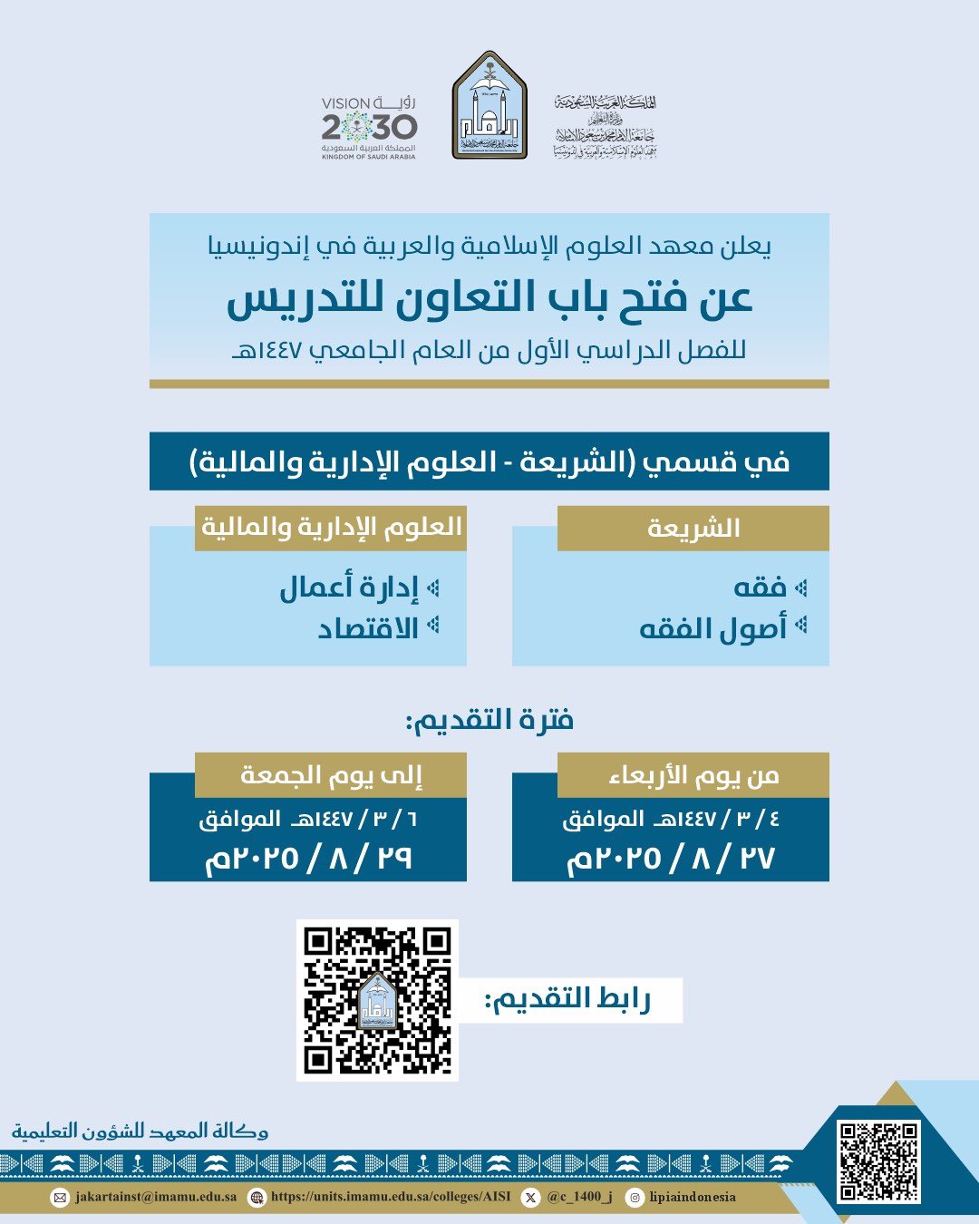 جامعة الإمام محمد بن سعود الإسلامية ممثلة في معهد العلوم الإسلامية والعربية في إندونيسيا تعلن عن فتح باب التعاون للتدريس للفصل الدراسي الأول من العام الجامعي 1447هـ، في تخصصات الشريعة والعلوم الإدارية والمالية، وذلك حسب التفاصيل الموضحة أدناه:-