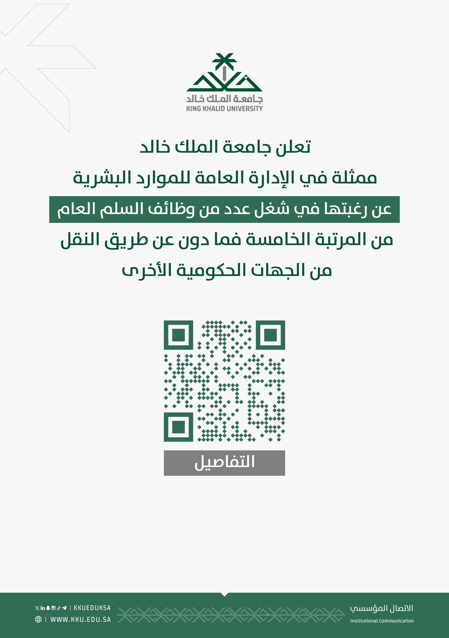 جامعة الملك خالد تعلن عن رغبتها في شغل عدد من وظائف السلم العام (المرتبة الخامسة فما دون) عن طريق نقل الموظفين من الجهات الحكومية الأخرى، وذلك بهدف استقطاب الكفاءات المتميزة وتعزيز بيئة العمل بالجامعة، وذلك حسب التفاصيل الموضحة أدناه:-